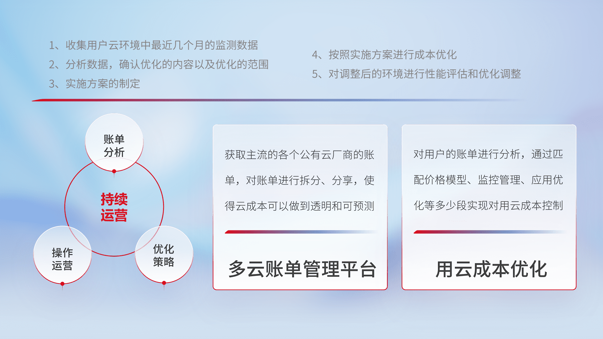 通过多云纳管,,,以统一的资源数据模型把客户的云资源进行抽象和封装,,进而实现对多云资源的统一操作,,保障云资源管理的可靠性、、、稳定性与可用性。。。。量身定制化运维内容,,配置、、、、开发运维、、、、补丁管理、、、、备份、、、、监控、、认证和访问管理、、、、审计和日常巡检等,,,保障在用云过程中的可靠度,,,稳定度以及高可用率。。。。